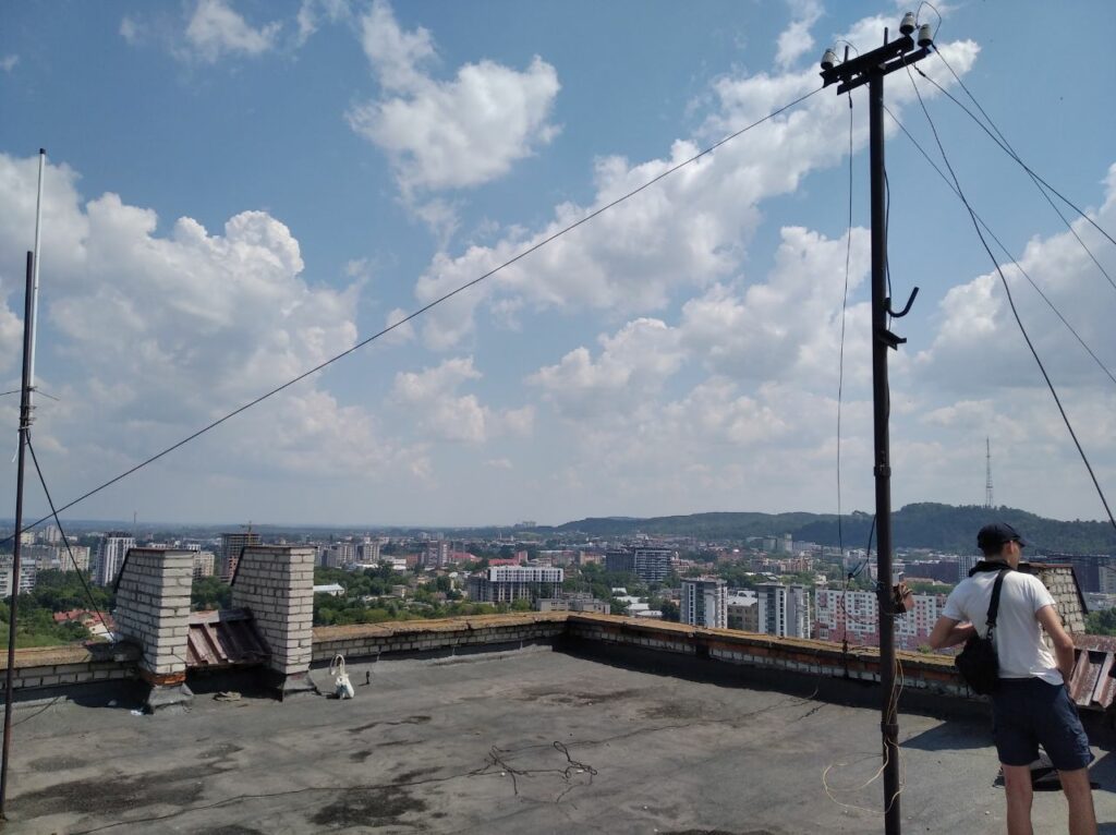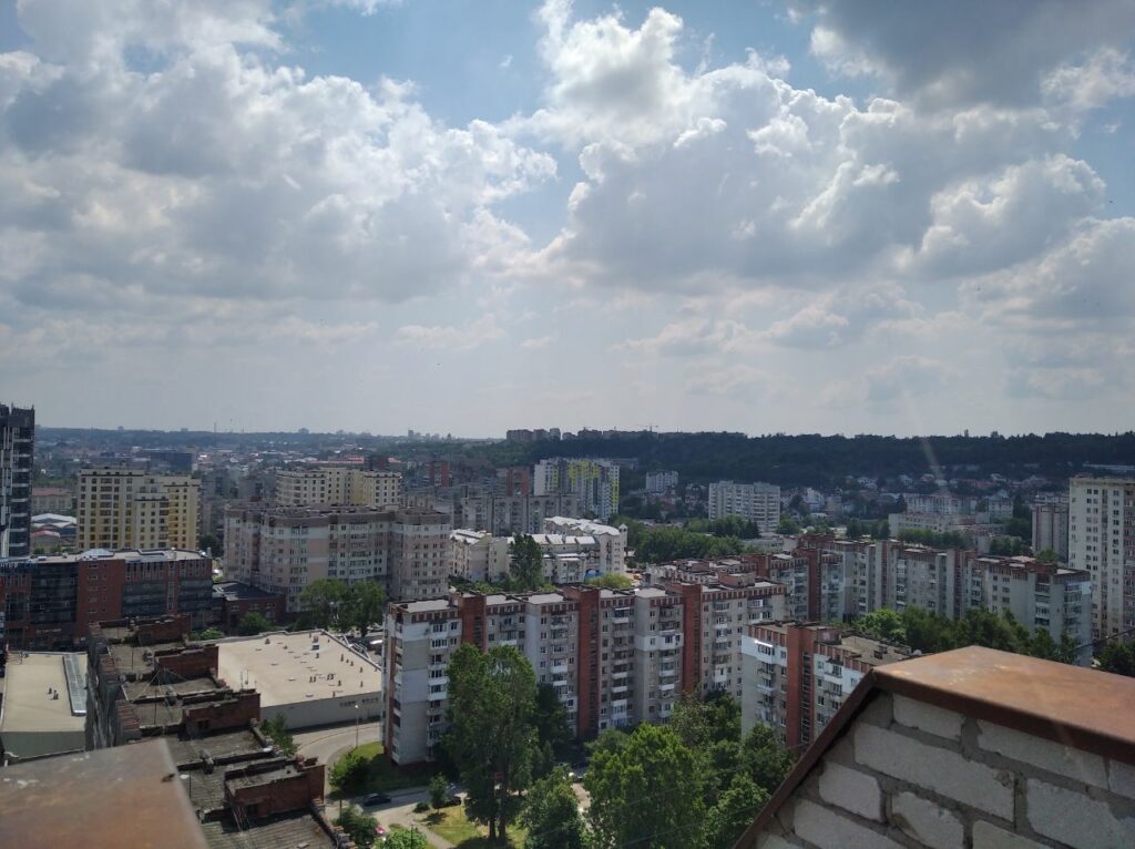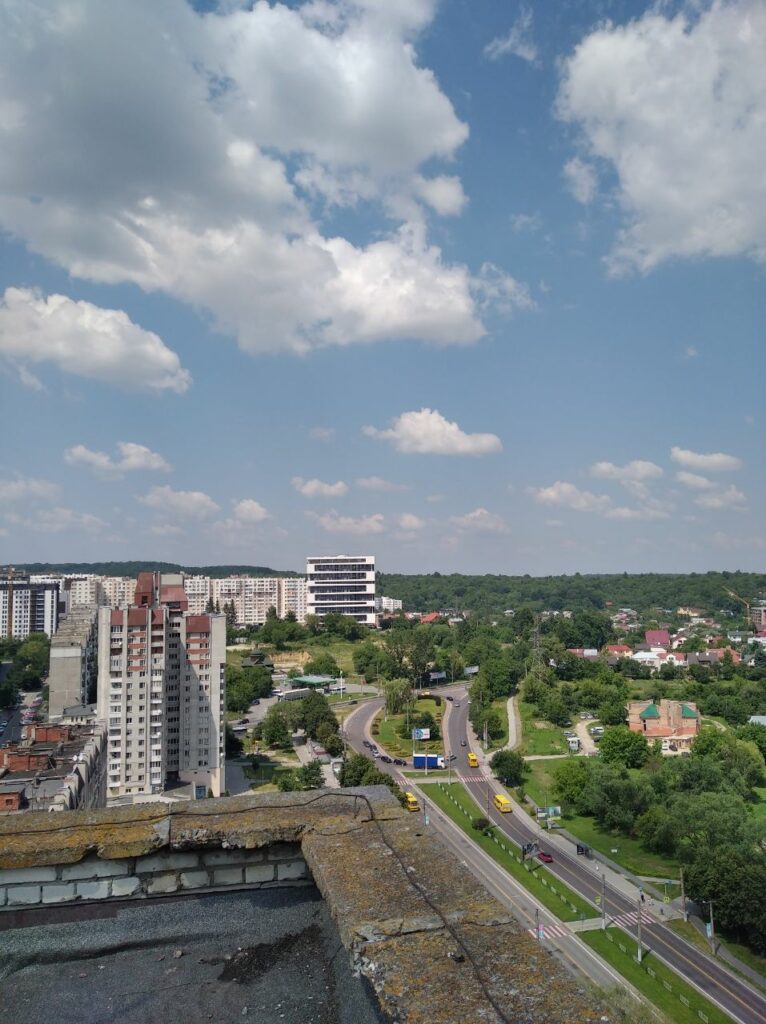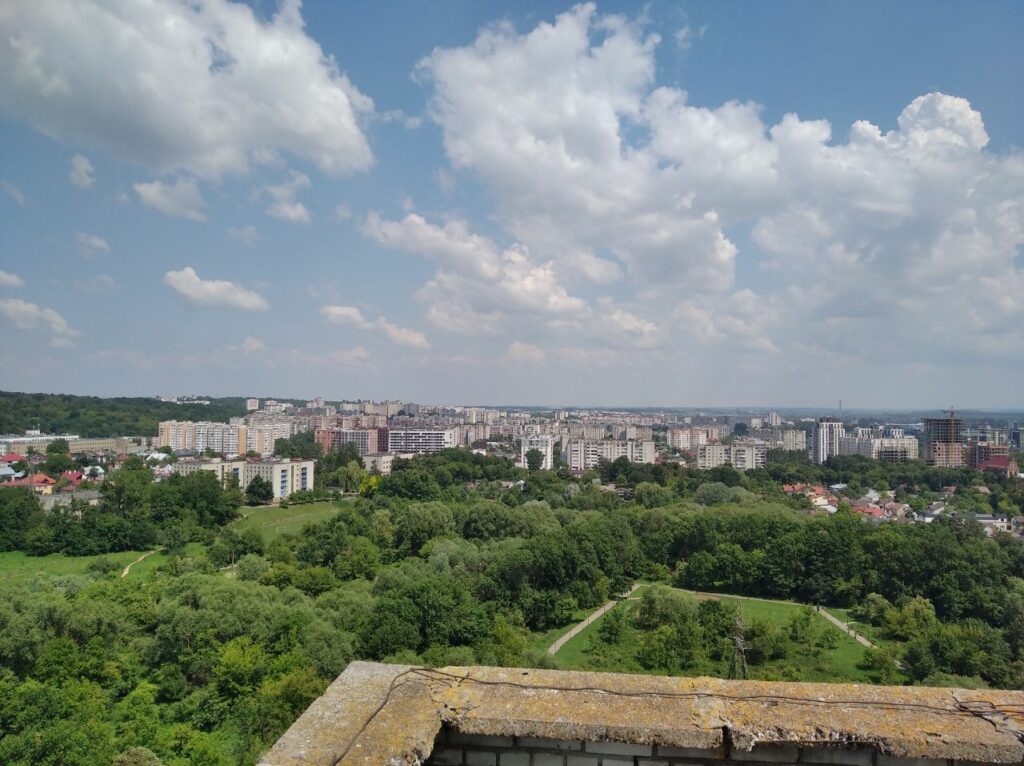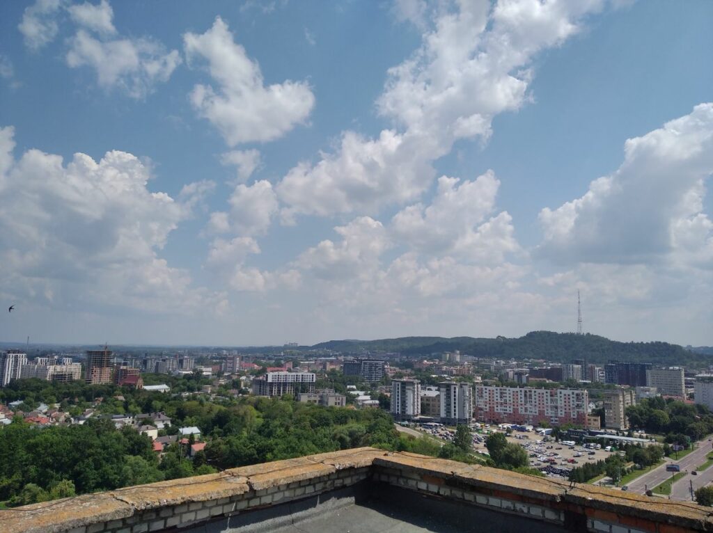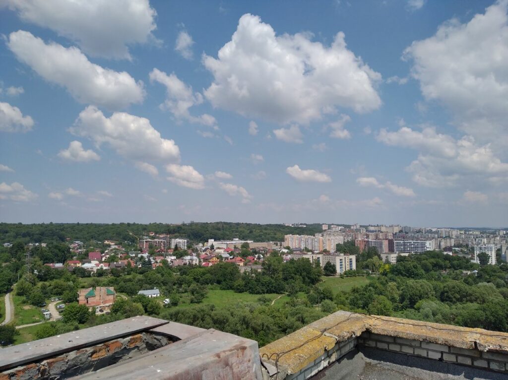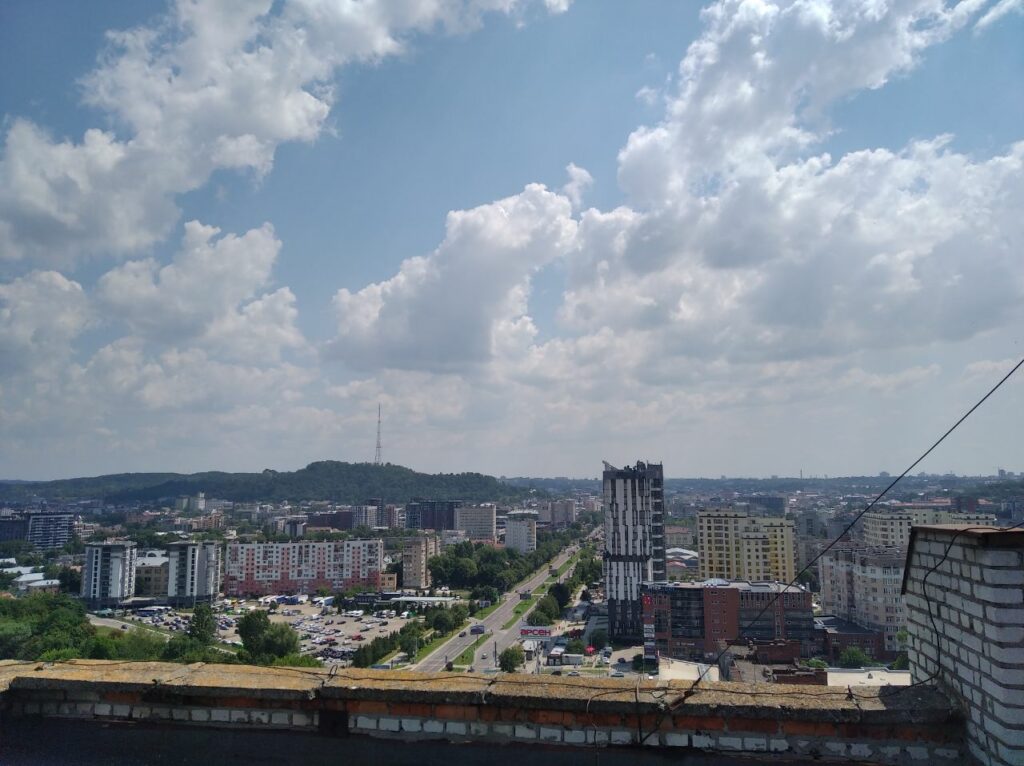 Ми, звісно що, були довше ніж десять хвилин. Бо з цього даху такі залипабельні краєвиди що я навіть не знав куди спочатку дивитися. Чи в центр і на Високий Замок, чи на Манхетен-style Підголоско. А прямий як стріла проспект Чорновола чого вартує! Чи зелені пагорби Кортумової гори… Львів різноманітний і найкраще цю різноманістність бачиш саме з висоти.