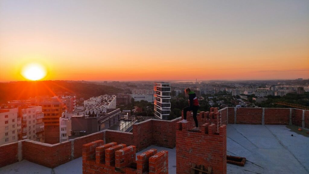 З ночі 31 травня на 1 червня ми абсолютно спонтанно вирішили на світанок сходити на цікавий дах. Гуляючи цілу ніч (було дууууже холодно) ми вже вирішили куди ж ми підемо і вирушили в дорогу. Обережно перелізли паркан, знайшли сходи і влаштували марафон в 18 поверхів.